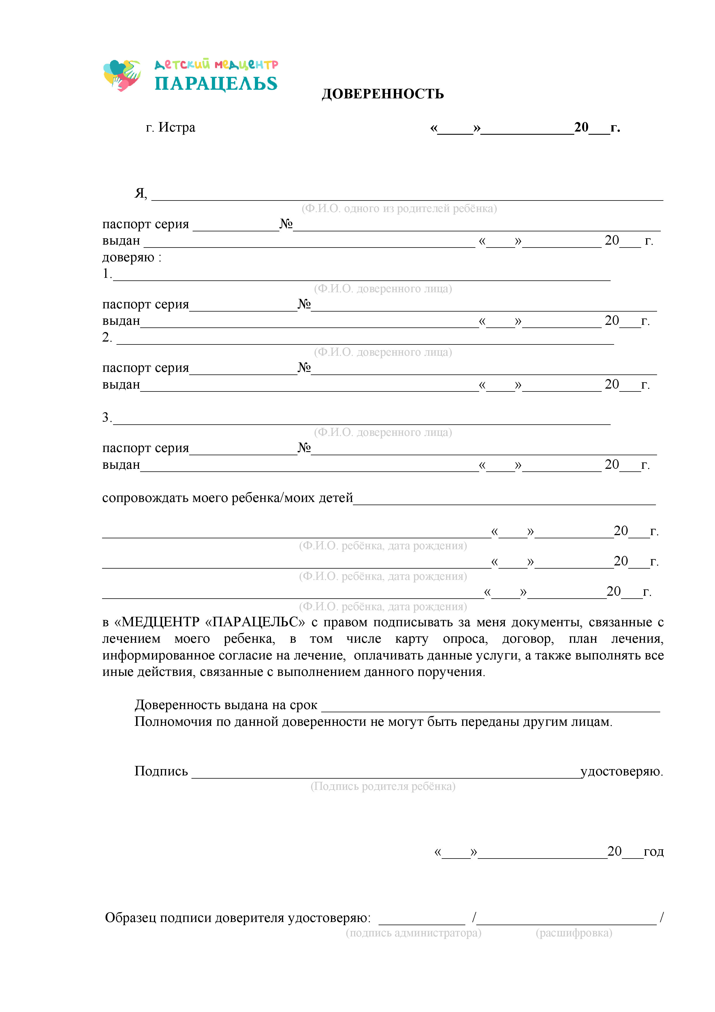 Если вашего ребенка на первичный прием в медицинский центр привели родственники (даже самые близкие) или знакомые, предварительно на сопровождающего необходимо оформить нотариально заверенную доверенность на право представления интересов пациента от имени одного из родителей. Для повторного приема будет достаточно обычной доверенности, представленной на этой странице. Заполните ее заранее и покажите на ресепшене.